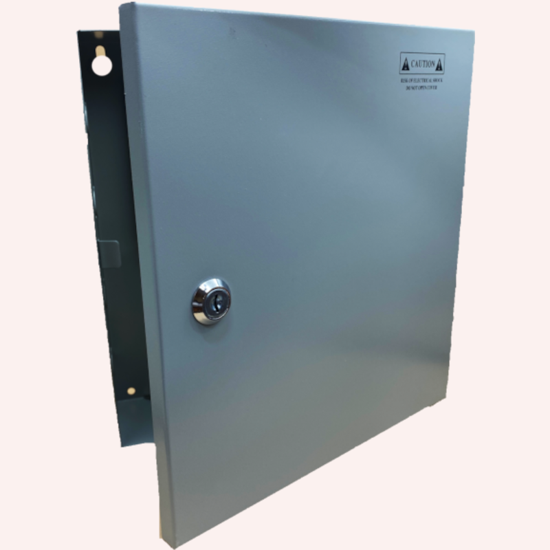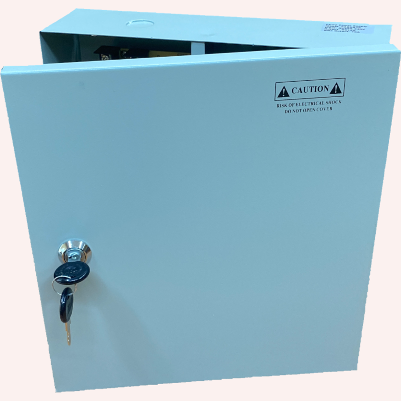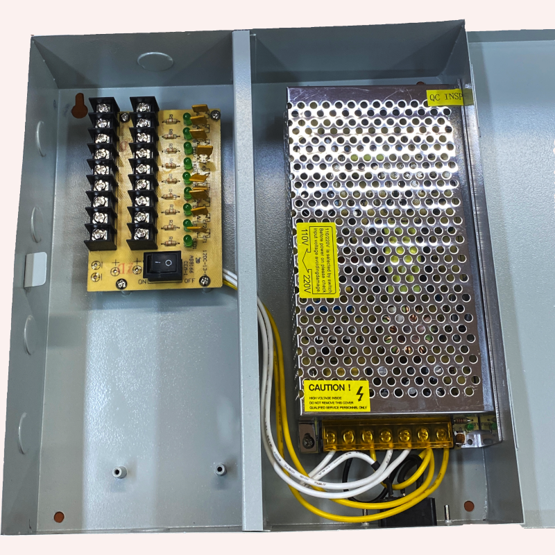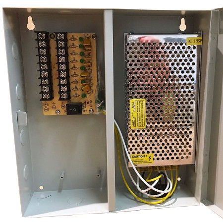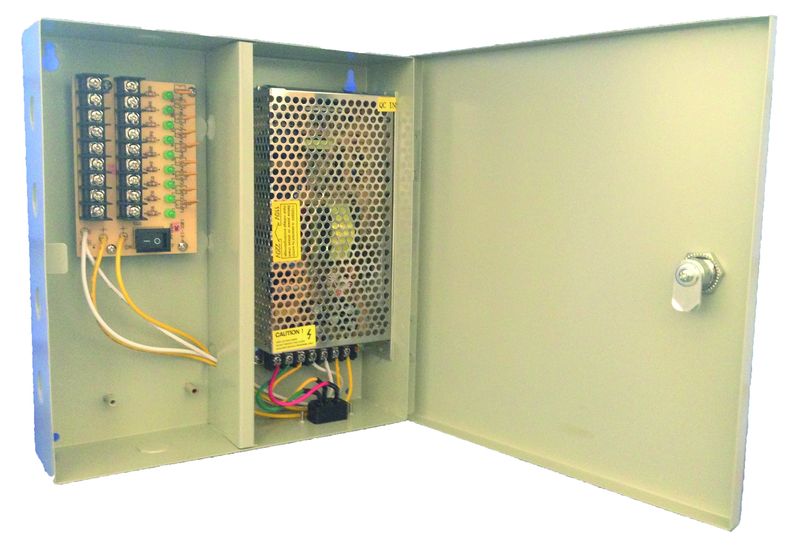 Fuente profesional conmutada de 12 V/15 A estabilizada. Carcasa mural. Distribuidor 9 cámaras. Fusibles protección por canal y uno general. LED verificación.